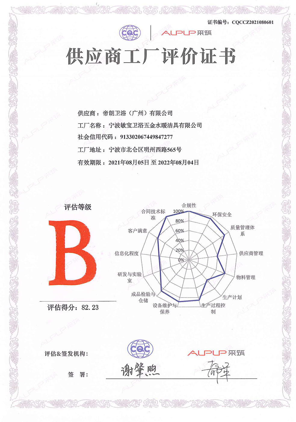 近日,乐动体育LOL成功通过采筑平台供应商审核,获得由中国质量认证中心和采筑平台共同签发的《供应商工厂评价证书》,成为采筑平台评分排名前列的卫浴产品供应商。